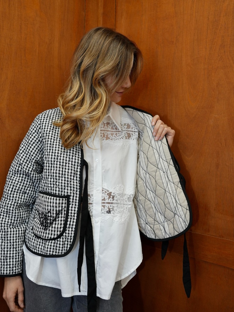 Sur les photos, la veste est portée avec une chemise blanche à dentelle et un jeans gris, créant un look féminin, confortable et moderne. Le contraste entre la dentelle délicate et le vichy matelassé donne une allure très sophistiquée.
