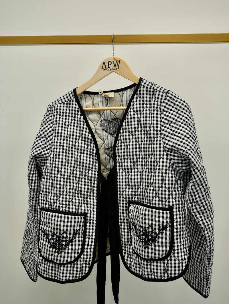 Cette veste matelassée vichy en 100% coton est une pièce forte, originale et ultra tendance. Elle combine l’esprit rétro du motif vichy à des détails travaillés : broderies noires délicates, nœuds à nouer sur le devant et intérieur contrasté. Le tissu matelassé apporte une agréable sensation de douceur et de chaleur tout en assurant un tombé structuré.
