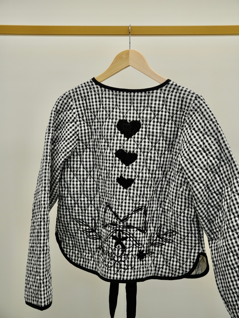 Sa coupe courte légèrement ample lui donne une silhouette moderne et facile à superposer. Les finitions contrastées en noir soulignent parfaitement les bords et les poches. Le dos révèle un travail brodé très élégant, avec motifs floraux et petits cœurs, qui rendent cette veste unique et visuellement riche.