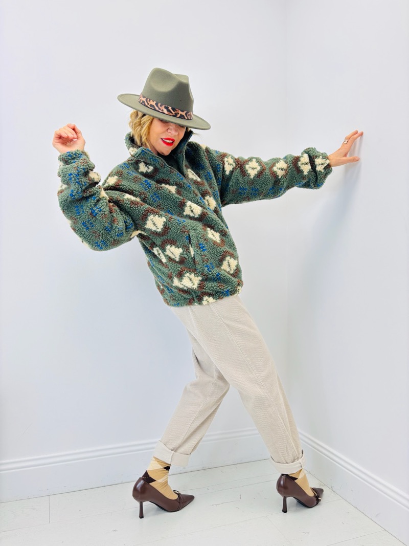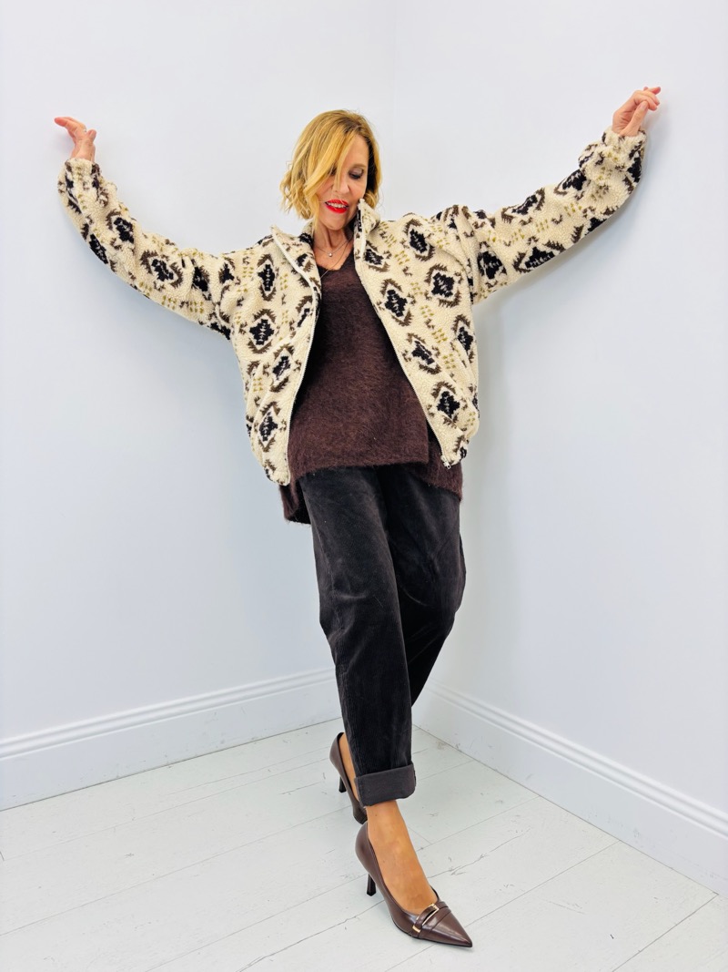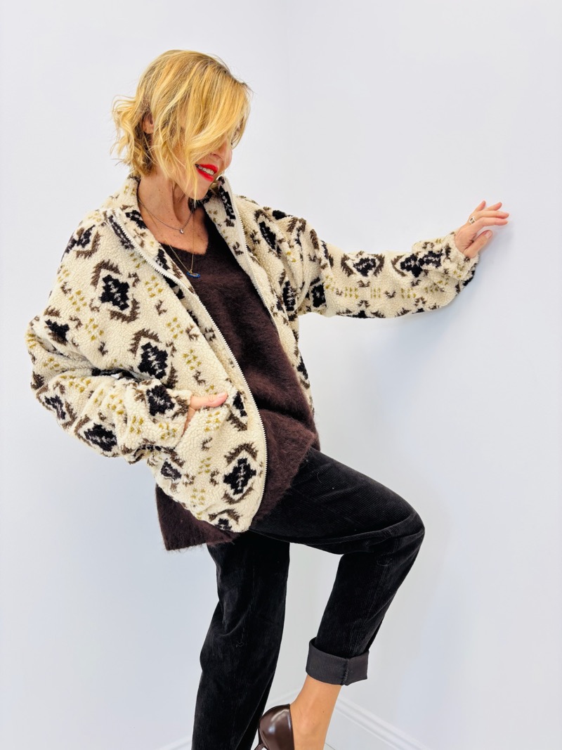 Portée ici en version beige imprimé, la veste crée un look cosy et tendance, parfait pour l’hiver.