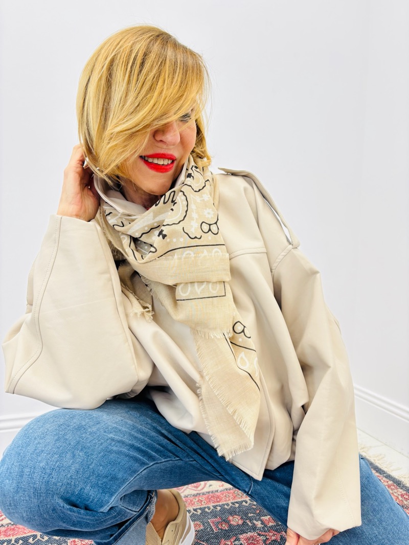 Les manches longues larges, avec une belle tenue, accentuent le volume oversize et donnent à la veste une allure affirmée. La matière présente un tombé net, qui structure la veste sans rigidité, parfaite pour la mi-saison. Les poches discrètes et les coutures apparentes ajoutent une finition moderne et qualitative.