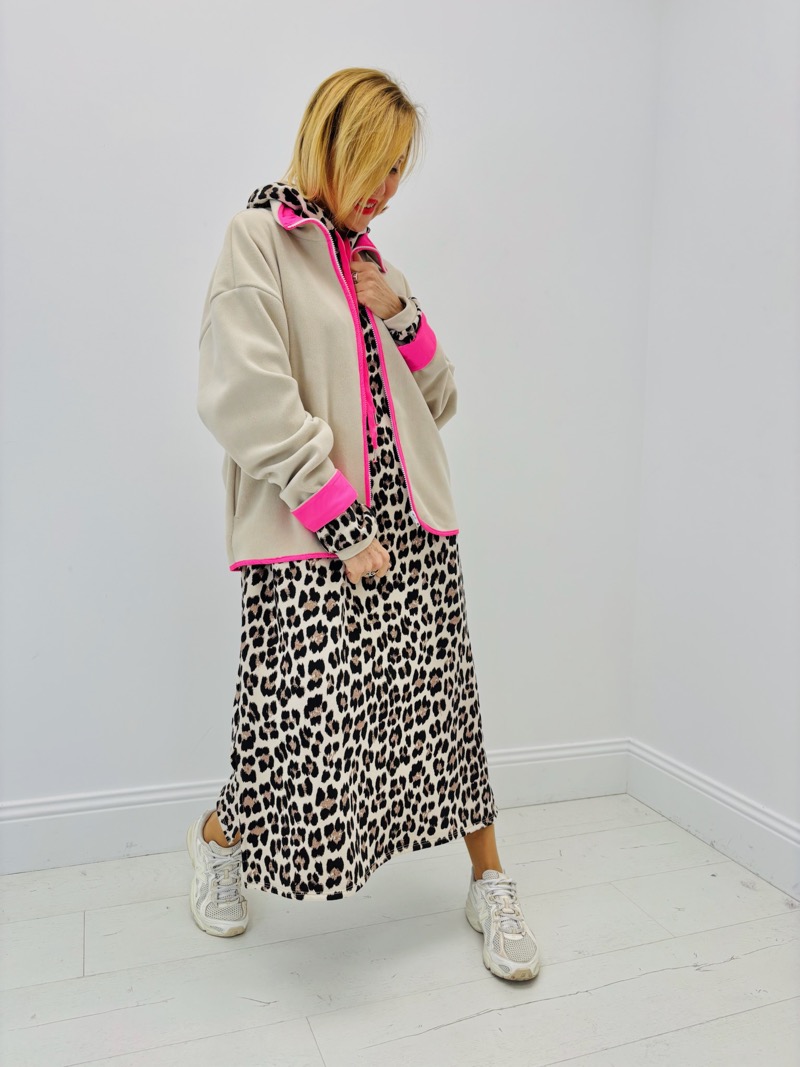 Portée sur une robe longue léopard, elle révèle un style urbain et affirmé tout en restant très confortable.