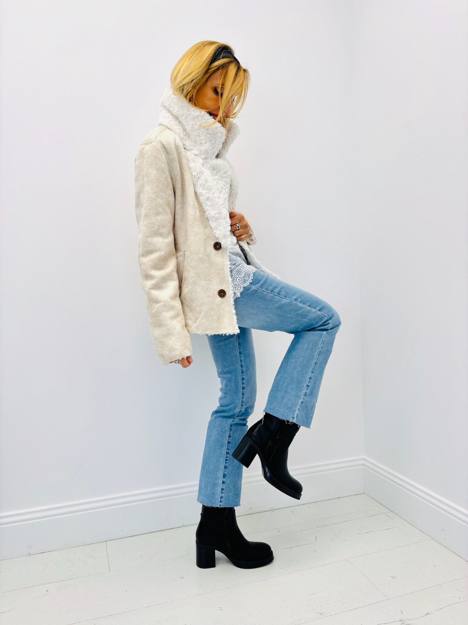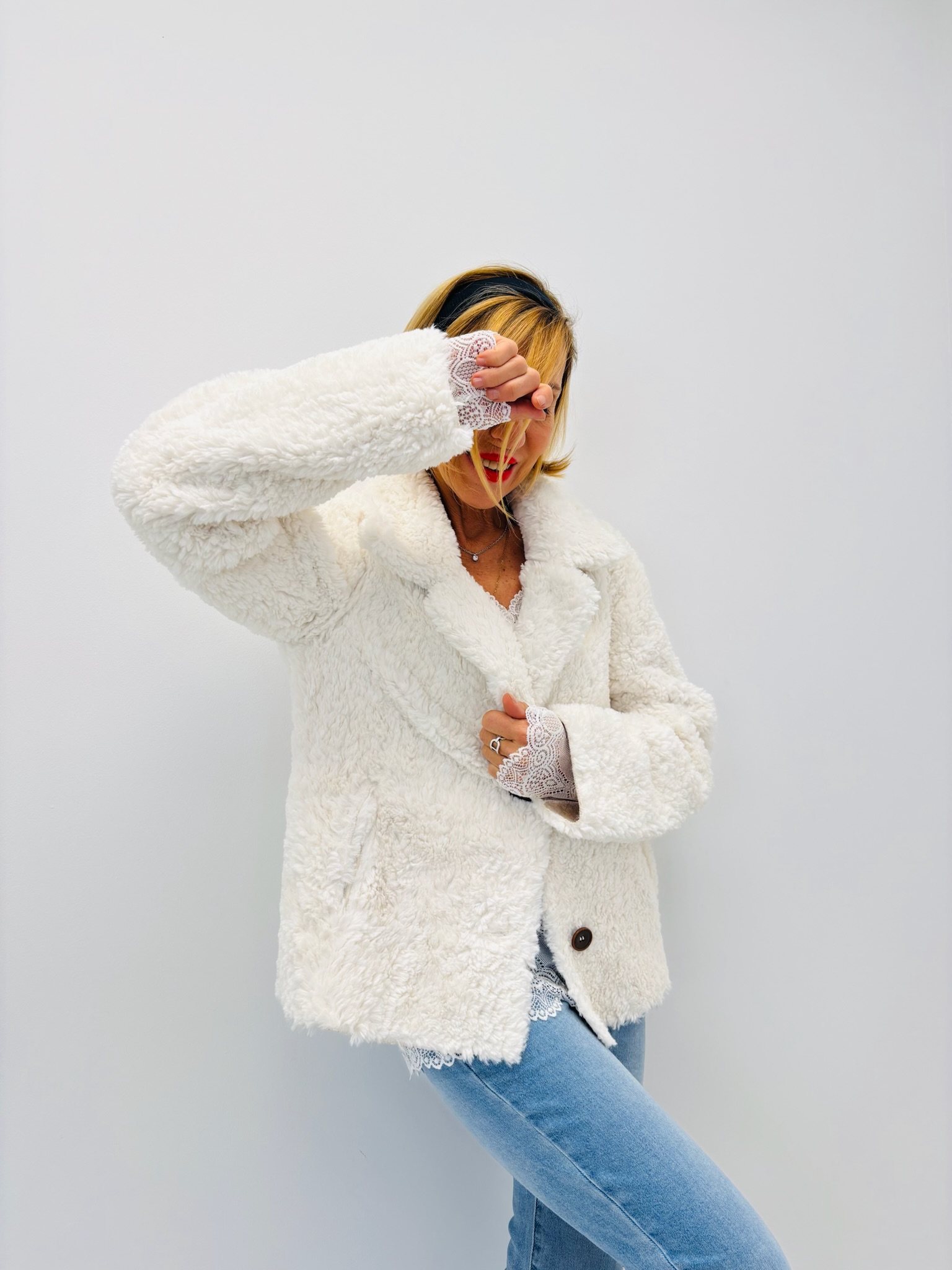 Sur la photo, la veste est portée côté fourrure, associée à un top en dentelle et un jean clair pour une allure chic et décontractée.