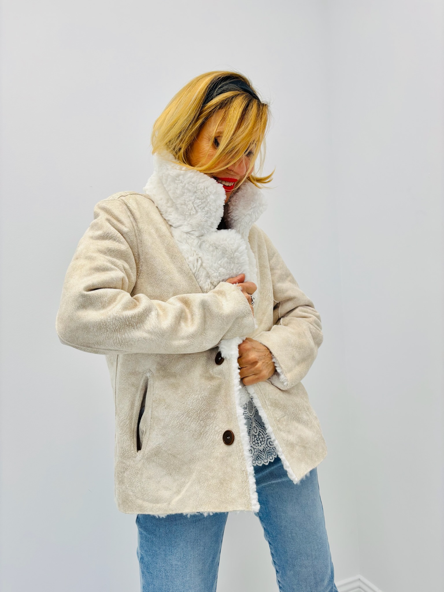 Un côté en fausse fourrure effet mouton pour un look chaleureux et tendance, et un côté suédine douce pour une allure plus raffinée et structurée.