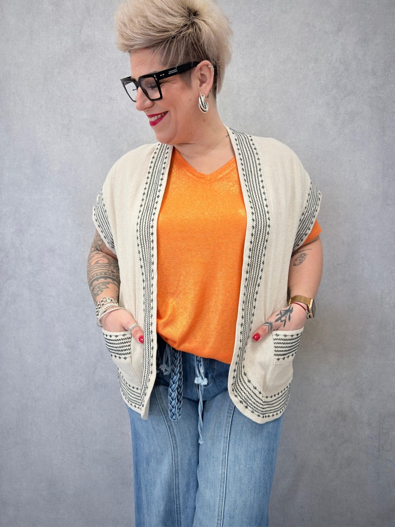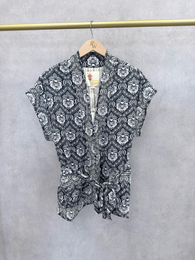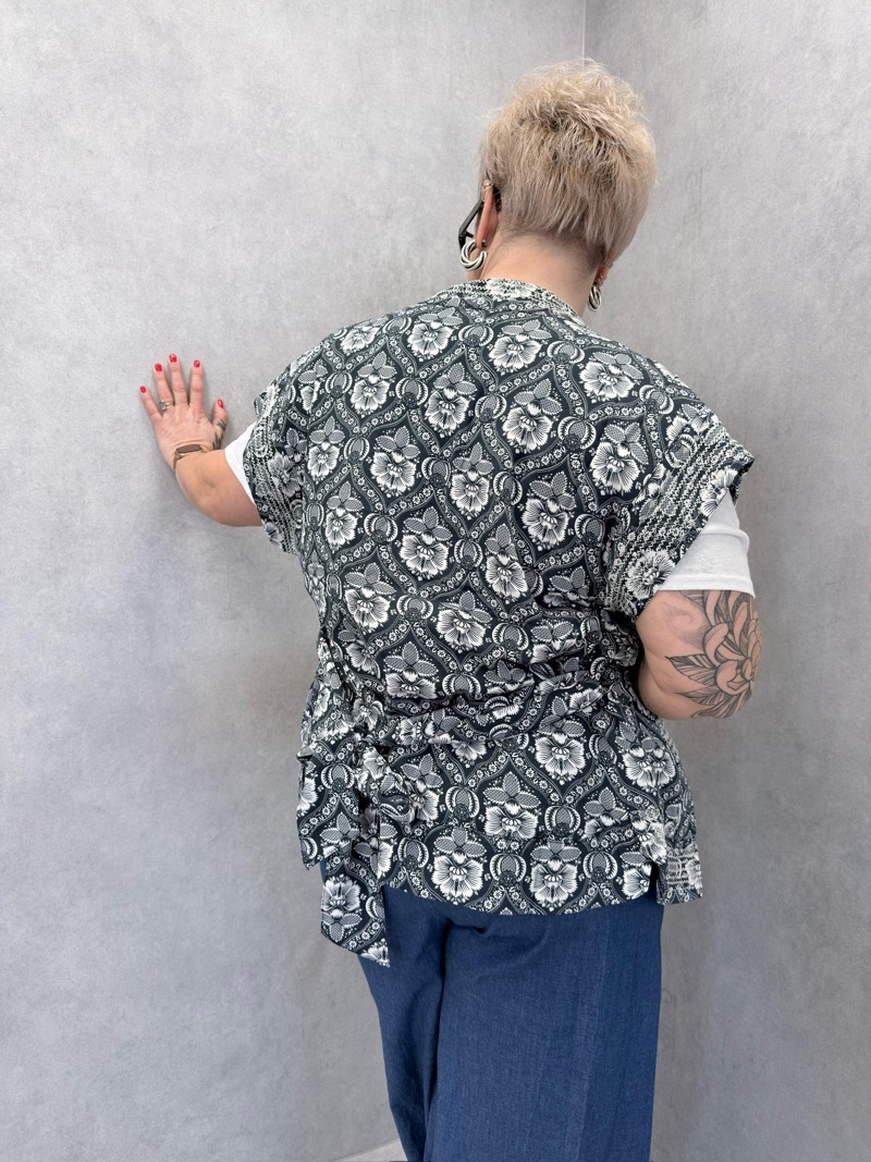 Cette veste sans manches au style bohème est une pièce forte qui apporte immédiatement du caractère à une tenue. Son imprimé floral graphique crée un look élégant et moderne, parfait pour compléter un outfit casual ou estival.