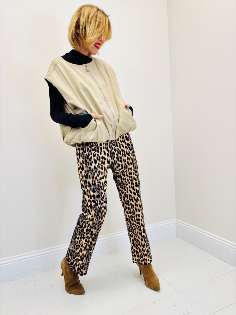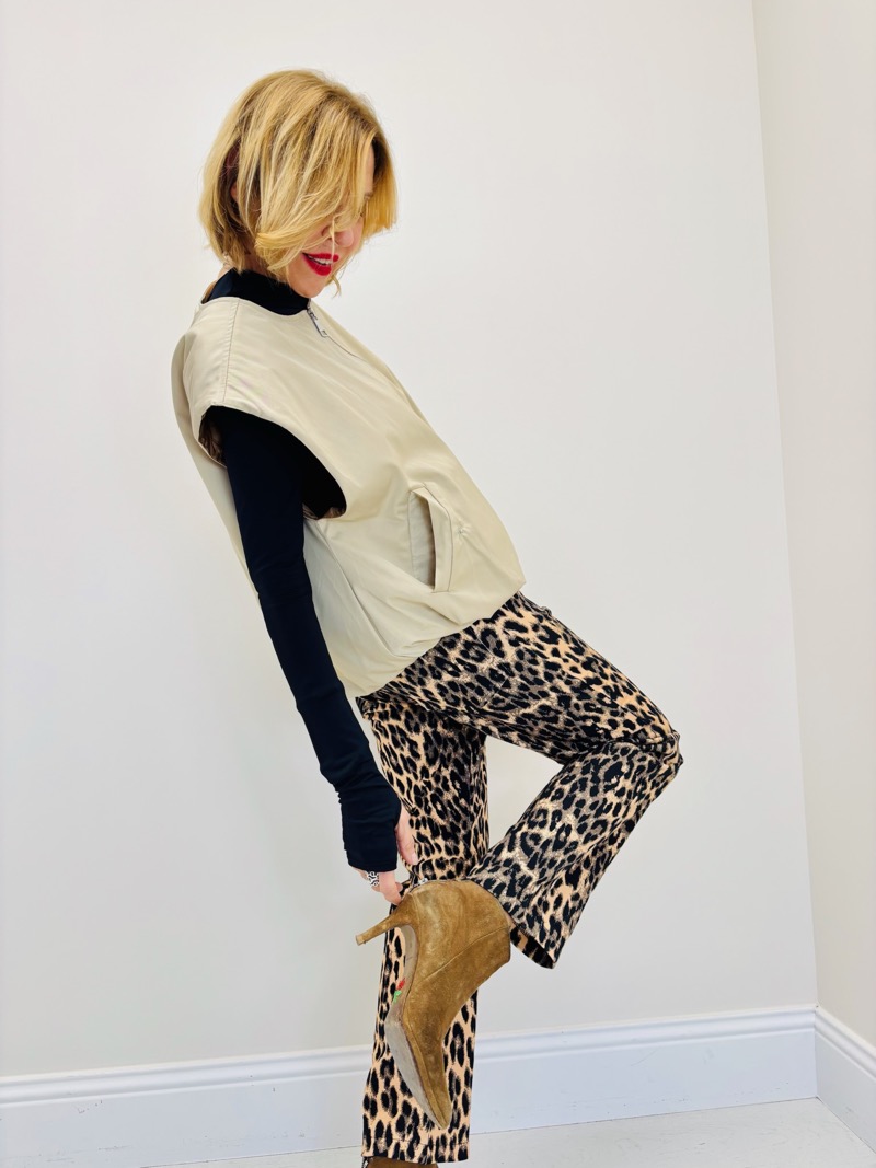 Sur les photos, la veste est portée par-dessus un sous-pull noir près du corps et associée à un pantalon imprimé léopard, créant un look audacieux et ultra-tendance. Le contraste entre la veste minimaliste et le motif animalier donne une allure forte, moderne et assumée.