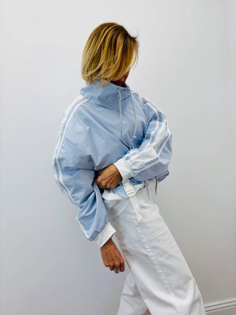 Cette veste se porte parfaitement avec un pantalon blanc ou un jean taille haute pour un look urbain moderne. Associée à des baskets, elle renforce l’esprit sporty.