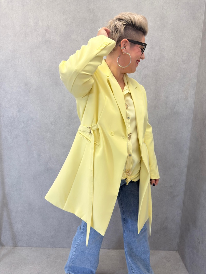 Dotée d’un col tailleur structuré, cette veste apporte immédiatement une allure chic et affirmée. Sa ceinture à nouer intégrée permet d’ajuster la silhouette selon les envies : portée serrée pour marquer la taille ou laissée plus lâche pour un rendu décontracté et moderne. Les poches discrètes sur le devant ajoutent une dimension pratique sans alourdir la ligne, tandis que les manches longues accompagnent naturellement le mouvement.