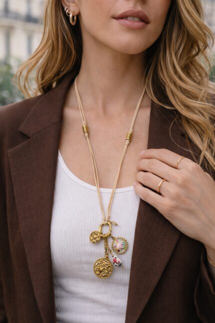 Sautoir Cordon Beige Multi Médailles Esprit Bohème