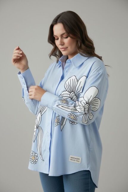 Chemise grande taille femme – Blanche à imprimé floral noir | Coupe oversize fluide et élégante