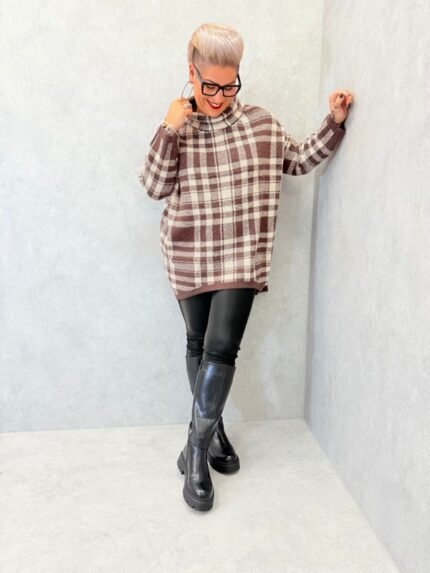 Pull long à carreaux marron et beige