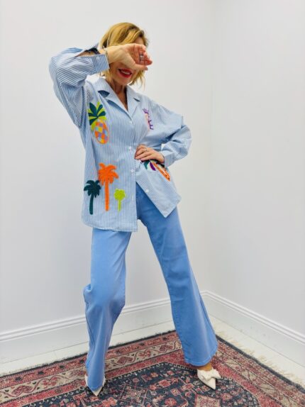 Chemise Rayée Bleue En Coton Avec Broderies Colorées Et Cœur Brodé