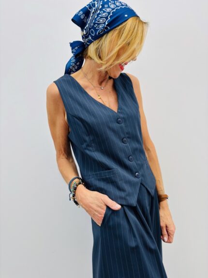 Associez un gilet de tailleur femme ou un gilet de costume sans manche avec une chemise blanche ajustée et un pantalon de costume. C’est la tenue phare du moment : le parfait mélange entre les codes du vestiaire masculin avec une élégance féminine. Le gilet noir sans manche pour femme apporte ici une structure immédiate et un côté très "couture".