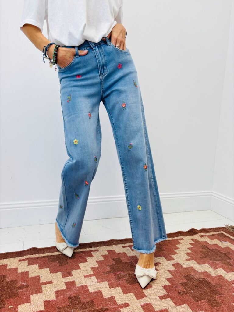 Cette saison, le denim dépasse le simple jeu de délavage : il s’orne de détails couture qui changent tout. Les clous métalliques injectent un esprit rock assumé, quand les broderies délicates et les perles apportent une touche bohème chic plus lumineuse. Ailleurs, des franges et des découpes nettes créent du mouvement et allègent visuellement la jambe. Les incrustations scintillantes et les surpiqûres contrastées soulignent les lignes, dessinent la poche ou la couture latérale, et donnent cette brillance mesurée qui capte la lumière sans en faire trop.
