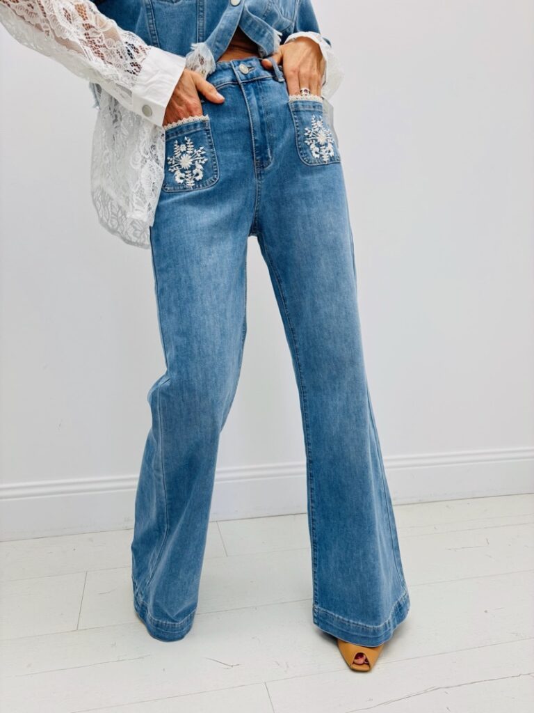Cette saison, le denim dépasse le simple jeu de délavage : il s’orne de détails couture qui changent tout. Les clous métalliques injectent un esprit rock assumé, quand les broderies délicates et les perles apportent une touche bohème chic plus lumineuse. Ailleurs, des franges et des découpes nettes créent du mouvement et allègent visuellement la jambe. Les incrustations scintillantes et les surpiqûres contrastées soulignent les lignes, dessinent la poche ou la couture latérale, et donnent cette brillance mesurée qui capte la lumière sans en faire trop.